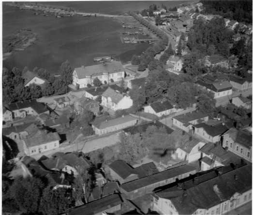 | ilmavalokuva: Lappeenranta, kylpylän seutua, Kaupunginlahti, satama, puisia asuinrakennuksia |