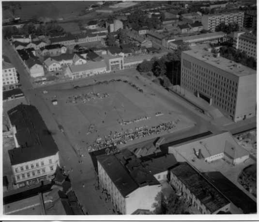 | ilmavalokuva: Kotka, aukio (tori?), kerrostaloja, puisia asuin- ja liikerakennuksia |