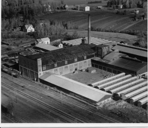 | ilmavalokuva: Hausjärvi, Ryttylän Tiilitehdas Oy, rautatie, tehdasrakennus, tiilien kuivatussuojat, taustalla peltoa, muutamia rakennuksia |