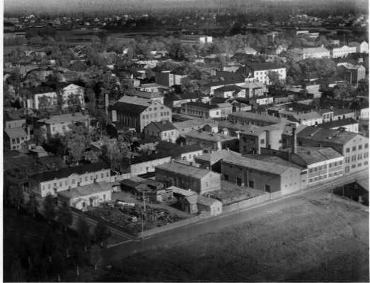 | ilmavalokuva: Hämeenlinna, puisia asuinrakennuksia pihoineen ja ulkorakennuksineen, tehdasrakennuksia, oikealla näkyy lääninhallituksen talo (C |