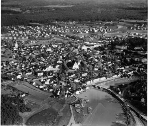 | ilmavalokuva: Porvoo, Porvoonjoki, ranta-aittoja, silta, tuomiokirkko, Vanhan-Porvoon asutusta |