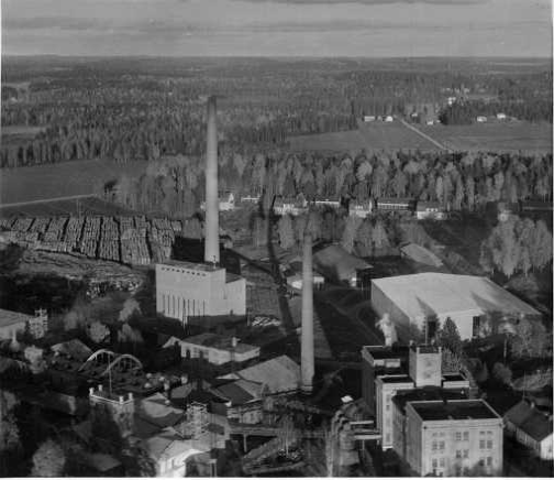 | ilmavalokuva: Janakkala, Tervakoski, Tervakoski Oy:n tehdasrakennuksia, asuinrakennuksia, puupinoja, peltoa, metsää |