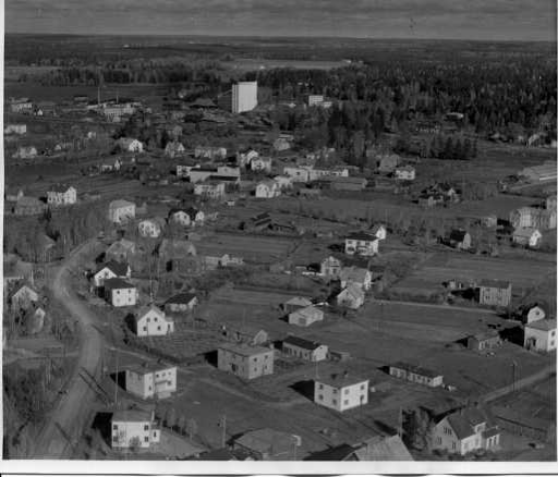 | ilmavalokuva: Järvenpää, puisia asuin- ja liikerakennuksia, taustalla SMK:n mylly ja rehunsekoittamo, tehdasrakennuksia |