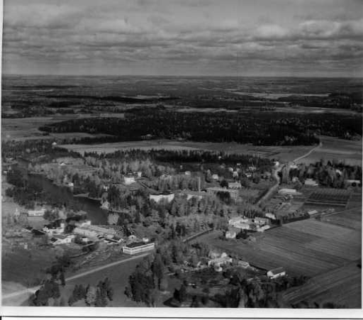 | ilmavalokuva: Tuusula, Kellokoski, tehdasrakennuksia, asuinrakennuksia, peltoa, metsää |
