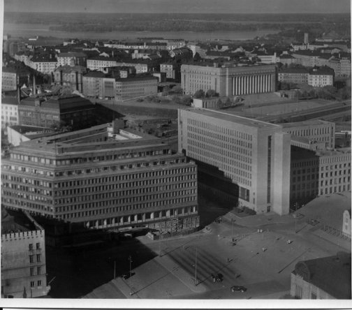 | ilmavalokuva: Helsinki, SOK:n talo, postitalo, taustalla eduskuntatalo, kerrostaloja |