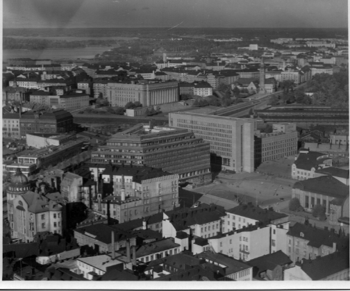 | ilmavalokuva: Helsinki, kerrostaloja, SOK:n talo, postitaloa, taaempana eduskuntatalo, oikealla rautatieaseman kulma |