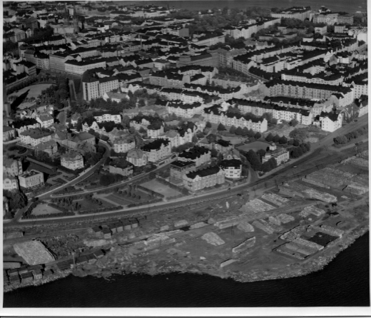 | ilmavalokuva: Helsinki, Eira, kerrostaloja, rannassa halkopinoja |