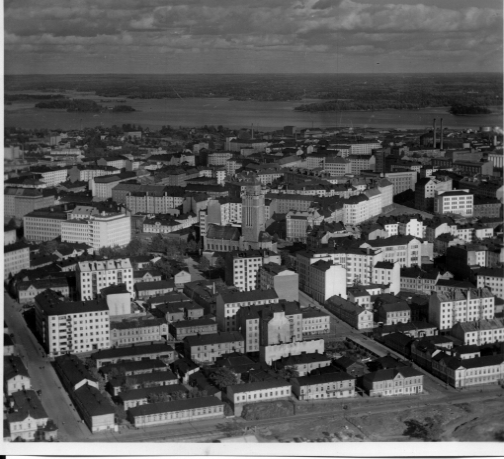 | ilmavalokuva: Helsinki, kerrostaloja, keskellä Kalllion kirkko (Lars Sonck 1908-12) |