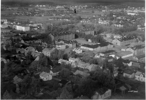 | ilmavalokuva: Hämeenlinna, puisia asuinrakennuksia, tiilirakennuksia, taustalla Vanajavesi ja Hämeen linna |