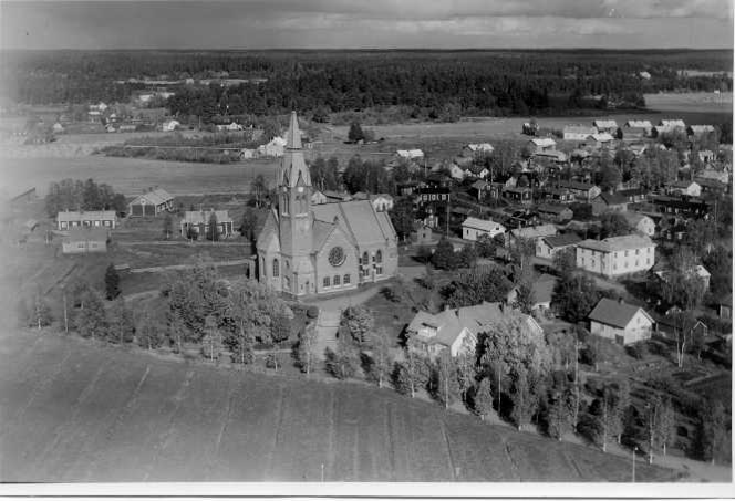 | ilmavalokuva: Forssa, kirkko, ympärillä puisia asuinrakennuksia ulkorakennuksineen, peltoa ja metsää |