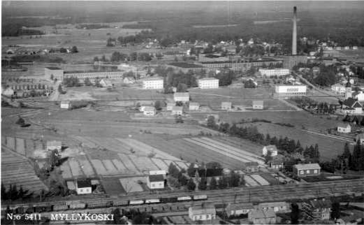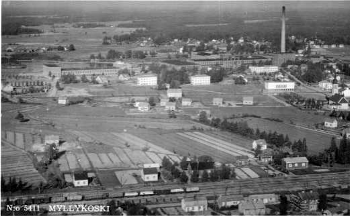 | ilmavalokuva: Sippola, Myllykoski, asuinrakennuksia, tehdas, oikealla kirkko (W |