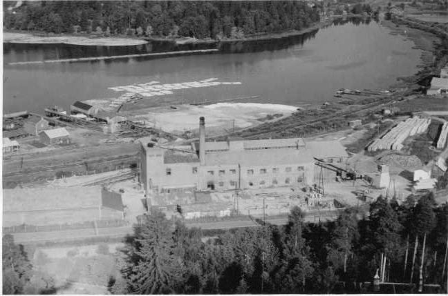 | ilmavalokuva: Hämeenlinna, Osuuskunta Metsäliitto Hämeen Tehtaat ? vaneri- ja lastulevytehtaat ? Tehtaan takana rautatie, Vanajaveden rannalla laivalaituri, pari höyrylaivaa ?, uittotukkeja, oikealla lautatarha, taustalla rautatiesilta |
