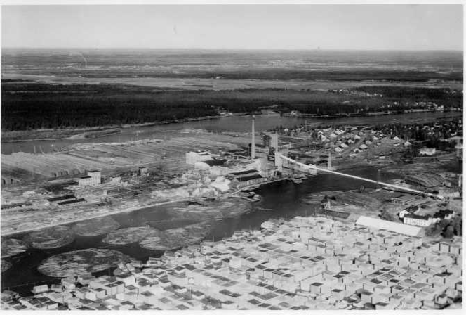 | ilmavalokuva: Kemi, Kemi Oy Pajusaaren tehtaat ? Edustalla Karihaaran saha ?Kuvaaja T |
