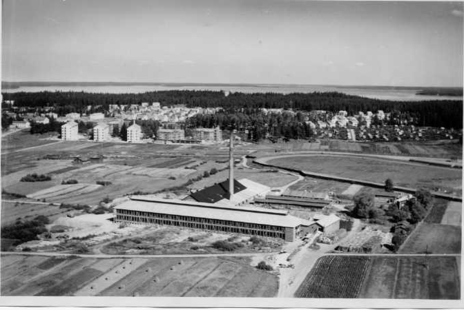 Puolimatkan tiilitehtaana tunnettu Auttila & Noppa Oy:n tehdas. Tehtaan oikealla puolella näkyy osittain vuoteen 1976 toiminut ravirata (Pohjois-Hämeen Hippos). Taustalla Kalevan kerrostaloja, Petsamon pientaloalue ja horisontissa siintää Näsijärvi.