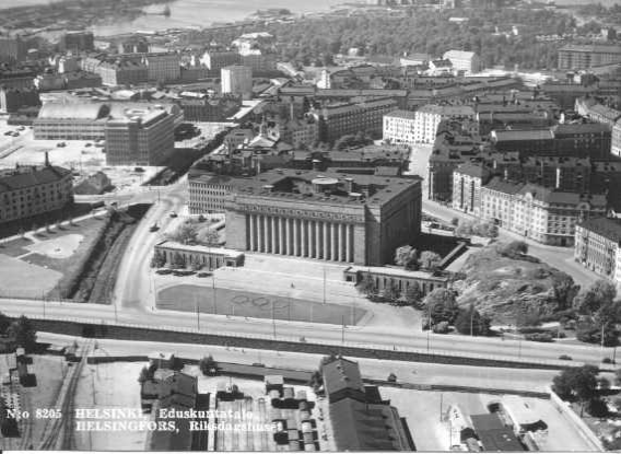 | ilmavalokuva: Helsinki, Eduskuntatalo, olympiarenkaat nurmikolla |