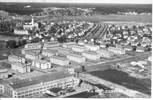 Etualalla Ajokin koritehdas, jonka takana kulkee poikittain Kuokkamaantie. Taustalla vasemmalla näkyy Viinikan kirkko.