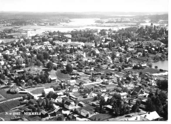 Mikkelin Rouhialaa kuvattuna Hanhikankaan suunnasta. Oikeassa yläreunassa näkyy heikosti Naisvuoren näkötorni ja siitä alaspäin Likolammen nurkkaus. Kuvan taka-alalla näkyy vesialue, nimeltään Savilahti (Savilax), josta Savon maakunta on saanut nimensä.