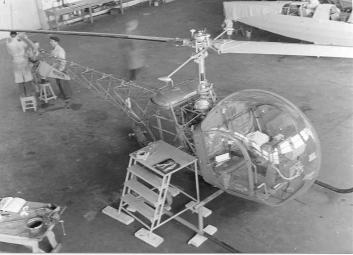 Suomen ensimmäinen helikopteri oli Imtran Voiman rekisteröimä Bell 47D-1, rekisteriltään OH-HIA, joka koottiin Kuorevedellä ja rekisteröitiin toukokuussa 1953. Ilmavoimat antoi kopterille tukikohtatilat Kuorevedeltä sekä asetti käyttöön niin ohjaajan kuin mekaanikon. Kopteria käytettiin pääasiassa IVO:n linjantarkastuslentoihin sekä vuosittain maksimissaan 30 lentotunnin verran Ilmavoimien tarpeisiin. Kopteri on nykyisin Suomen Ilmailumuseossa Vantaalla.Kuvassa kopteria kootaan maahantuonnin jälkeen Karhumäen hallissa. Taustalla näkyy todennäköisesti ilmavoimien Focke-Wulf Fw 44J Stieglitz -tyyppinen harjoituskone peruskorjauksessa.