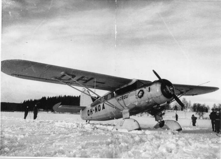 Kuvassa maineikas kanadalaisvalmisteinen puskalentokone Noorduyn UC-64A-ND Norseman. Konetyyppi oli tunnettu vahvasta rakenteestaan ja suunniteltu kuljettamaan rahtia vaikeissa olosuhteissa.OH-NOA oli valmistunut vuonna 1944 ja oli USAFin käytössä Euroopassa II maailmansodan aikana. Kone myytiin sodan loputtua Sveitsiin, josta se ostettiin Suomeen vuonna 1951. Kuvassa kone on todennäköisesti jyväskyläläisten Särkän veljesten omistuksessa (vuosina 1958-69). Kone oli saanut jo ennen Särkän veljeksiä lempinimekseen Norsu, ilmeisesti suuren kokonsa ja nimensä perusteella. Koneen profiloidut sukset on otettu ilmavoimien entisestä Fokker C.X. -syöksypommittajasta. KOnetta käytettiin yleisölennätyksiin.