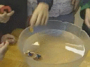 Oppilaat uittavat pientä venettä vesiastiassa. Oppilaat liikuttavat venettä vetämällä sitä magneetin avulla eteenpäin. Veneen päässä on rautainen nasta, johon magneetti tarttuu.
