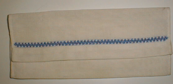 Merseroitua puuvillaa. Valkoinen, jossa sininen ristipisroraita kannessa. Käsinommeltu. Lautasliina (n:o 1362) ollut laukussa.