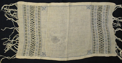 Palttinasidoksinen harvahkoon kudottu kaitaliina, jonka päissä hapsut. Liinaa kiertää sinisella langalla tehty nurjaton etupistokirjontakuvio. Liinan päädyissä sidepistorevinnaisenä tehdyt raidat.