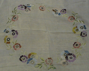 Iso liina, jonka reunat on huoliteltu reikaompeleella. Keskelle kirjottu kehämäiseen muotoon kukka-aihe side-, varsi- ja laakapistoin.