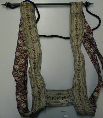 kaksi ripustuskepistä roikkuvaa harvahkosti kudottua lenkiksi nauhaa, joihin on kirjottu ornamentti ristipistoin. Nauhojen nurja puoli on huoliteltu punaisella kukallisella puuvillakankaalla. Kirjotut lenkit on yhdistetty toisiinsa samanlaisella lyhyellä vaakasuuntaisella nauhalla. Keppiin on kiinnitety punainen ripustusnyöri. Kepin päät on sorvattu.Kannattimessa voi pitää kahta tarjotinta.