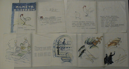 neljä käsin puuvillakankaalle piirrettyä ja maalattua satukirjan aukeamaa, joissa ruotsinkielisiä runoja