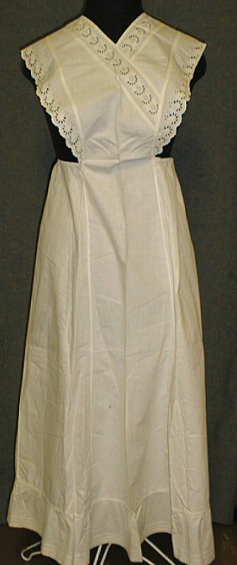 pitkä valkoinen esiliina, jossa etumustan pääntielle ja sivuille ommeltu teollinen brodyyrinauha. Helmassa kangaspoimutelma, jossa laskossarja alareunassa. Takana solmiamisnauhat.