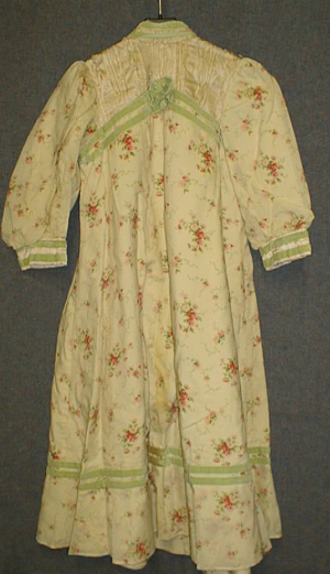 puuvillakankaalla vuoritettu tytön puku, jossa puolipitkät hihat. Kangas on kukikasta, kaarroke edessä ja takana on hiuslaskoksin koristettua silkkikangasta. Somisteena. pytykauluksessa, helmassa ja kädentiellä vaaleanvihreää samettinauhaa. Samasta nauhasta tehty ruusuke keskelle eteen.Takana keskellä hakaskiinnitys (11kpl).