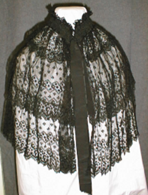 teollisesti valmistetusta mustasta tyllipohjaisesta pitsistä ommeltu hartiavaate (kolme eri levyistä osaa ommeltu yhteen). Kiinnitetään edestä silkkinauhalla. Osa nauhasta ommeltu valmiille rusetille. Pieni pystykaulus, jonka yläreunaan on ommeltu pitsipoimutus ja hakaskiinnitys.