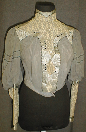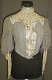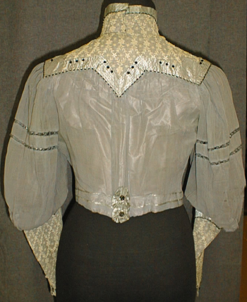 Naisen useasta kappaleesta luin tuettu pitkähihainen, pystykauluksinen jakku. Alimmainen kangas harmaan viloettia silkkiä ja päällimmäinen ohutta puuvillaharsoa, johon on kiinnitetty luonnonvalkoisia pitsiosuuksia etumustaan, kaulukseen ja hihansuihin. Lisäksi koristeena tikattuja harmaita silkkikaitaleita, joihin on ommeltu silkkilangasta tehtyjä mustia pieniä pallokoristeita.Takana kaksi pientä ruusuketta, joiden keskellä helmikoristelu.Vyötärökaitaleessa teksti A La Parisienne Helsingfors.