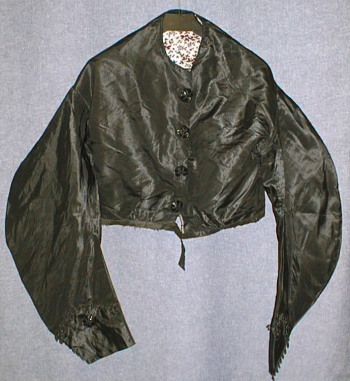 Musta silkkitaftinen naisen vuoritettu jakku, jossa pitkät kyynärtaipeen kohdalla levenevät hihat. Pyöreä, kaulukseton pääntie. Edessä neljä pyöreää helmin koristettua nappia. Samanlaiset napit hihansuissa, missä myös nauhamainen ommeltu helmikoristelu.Vuorikangas valkopohjaista kasviaiheista punakuvioista puuvillakangasta. Hihojen vuorikangas ruskeaa puuvillakangasta.Hihanpyöriön saumassa mustat tereet. Vyötäröllä ommeltuna nauha, jossa yksi hakaskiinnitys. , Koivupahkasta koverrettu, laidat ulkonevat. Ulkopuolen pohja halkaisijaltaan n 10,5 cm. Yläreuna epätasainen. Sisäpinta mustunut.