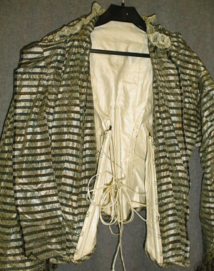 tyköistuva naisen jakku, jossa on edestä seitsemän lehtiäisparin avulla nyöritettävä puuvillainen vuoriosa. Mukana valkoinen puuvillanyöri. Vuoriosassa yhdeksän "tukiluuta". Jakun etumus on voimakkaasti edestä alas kaartuva. Hihat ovat alaspäinlevenevät, melko suljetulla pääntiellä pitsipoimutus. Hihansuissa nyörikorstelu ja hapsunauha.