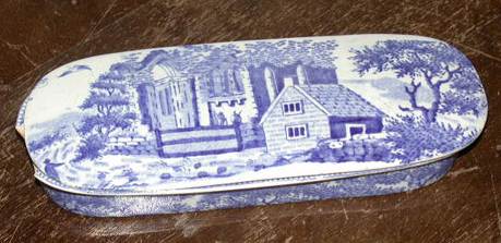 Kannellinen rasia. Fajanssia ja väriltään luonnonvaalea. Koristeena rasia maalattu kauttaaltaan sinisellä rauniolinnamaisemalla. Maisema kokonaisena kannen päälipuolella ja yläosastaan rasian kyljessä. Rasian reunan sisäpuolella kiertää koristeltu sininen nauha. Rasian pohjassa ei ole tehtaan merkkiä.