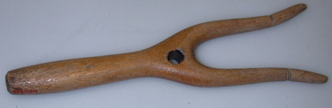 Kaksihaarainen, hankomainen nauhantekovälinen. Siinä on varsi, josta haarautuu kaksi ulospäin taipuvaa piikkiä. Piikkien yläosassa on leveyssuunnassa urat. Varren yläosassa on reikä. Varsi ja piikit on veistetty pyöreiksi. Nauhahanko on valmistettu koivusta ja se on pintakäsitelty lakkaamalla.