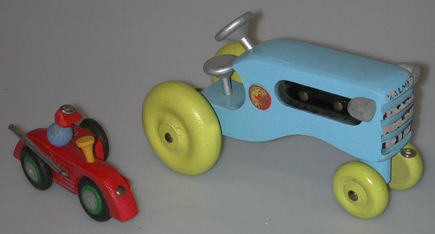 runko punaiseksi maalattua puuta. Takana toisessa sivussa ulkonema. 3 pyörää, joiden keskiosa maalattu hopean väriseksi ja kehystetty vihreällä. Kumirenkaat. Takapyörissä akseli, etupyörä naulattu. Toisessa sivussa pakoputki, läkkipeltiä. Eteen kiinnitetty metallinuppi lampuksi. Keltainen, sorvattu puutappi rattina. Ajaja muodostuu 2 puuhelmestä, joista alempi sininen ja ylempi punainen. Punaiseen helmeen maalattu mustalla silmät, nenä ja suu. Päähineenä metallinasta, johon kiinnitetty punainen muovilippa. Pyörään maalattu hopealla: TOMMY, Speed way ja vauhtiraidat. Takapyöriin kiinnitetty metallilanka, jonka avulla lisätään vauhtia.