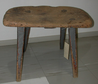 Nelijalkainen jakkara, joka on ollut selkänojallinen tuoli. Jalat nelisivuiset, kapenevat ja kaareutuvat ylöspäin, istutettu istuinlaudan läpi. Istuin puolipyöreän muotoinen, yksipuinen, kovin kulunut päältä. Takareunassa kaksi läpireikää, pitkänomaisen suorakaiteen muotoista, joihin ollut selkänoja. Reikien väli on n. 7 - 7,5 cm. Maalattu siniharmaaksi. Väri kulunut pois. Siniharmaan maalin alta kuultaa punaruskea maalikerros.