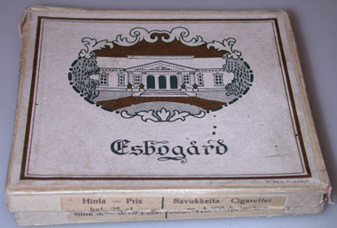 Pahvinen valkoinen rasia. Kannessa etiketti, jossa medaljongin sisällä kartanon kuva, ja teksti Esbogård sekä kaksi vaaleanruskeaa etikettiä kiertävää reunaviivaa. Edessä erillinen paperilappu, jossa mustalla teksti: "Hinta - Pris kpl 25 st Smk 3: - 3:75 Fmk. Savukkeita. Cigaretter pr. 1000 kpl. st. ja sen alla Smk. 120:- 150:- Fmk. Laatikon sisällä on irrallinen kuva August Ramsaystä.