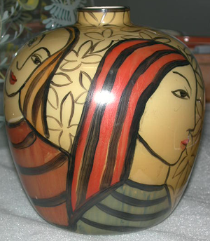 Pohjassa mustalla tekstattuna Molander ja hyvin epäselvästi Kauklahti. Maalattu siluettimaisesti naisia ja kukkia. Levenee ylöspäin, kapenee sitten nopeasti lähes kaulattomaksi suuksi. Maalattu kolme naishahmoa mustalla: yhden tukassa vihreitä, puserossa ruskeita raitoja; toisen tukassa keltaisia (oransseja), puserossa punaruskeita; kolmannen tukassa punaisia, puserossa vihreitä raitoja. Yhdellä kukkakimppu vihreää, keltaista, punaista, sinistä. Maljakon muu pinta täytetty mustin ääriviivoin maalatuilla kukilla.