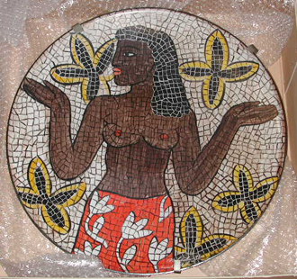 Maalattu laakea pyöreä lautanen, johon maalattu voimakkaasti tyylitellen, paksuin viivoin mustaihoinen nainen ja kukkia. Pinta ruudutettu mosaiikkimaisesti. Peltiset kiinnikkeet, joiden varassa ripustustuslenkki. Faarao- ja Afrikka -vaikutteita. Ruskeaihoinen nainen vyötäröä myöten, yläosa paljaana, vartalo kuvattuna edestä, pää vasemmalle kääntyneenä, kädet levitettyinä sivuille kyynärpäistä koholla, musta tukka oikealle olkapäälle, oranssissa vyötäröhameessa valkeita kukkia, ympärillä neliterälehtisiä, ristikukkamaisia kukkia, joissa keltaiset reunat, musta sisus, kukista neljä kokonaista, yksi osittain näkyvissä, reuna ruskea, valkea väri opaalista. Alalaidassa taiteilija Molanderin signeeraus.