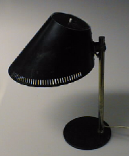 Jalusta pyöreä peltilaatta, siitä kohoaa suora messinkivarsi, jonka yläpäässä siipiruuvin avulla liikkuva varjostin, joka myös mustaksi maalattua peltiä. Varjostin levenee alareunastaan etupuolelleen, reunaa kiertää lävisteraita. Valkoinen muovijohto. Hehkulamppu 75 W.