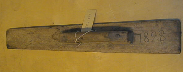 Lautamainen kappale suippenee hiukan kärkeään kohden. Päälle kiinnitetty kahdella puutapilla vankka kädensija. Kädensijan taakse veistetty vuosiluku 1828. Pinta käsittelemätön.
