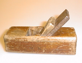 Suorakulmainen tukki petsattu ruskeaksi. Keskellä kolmiomainen reiä, jossa raudasta valmistettu terä ja puinen kiila.