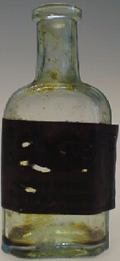 Pieni, 8-kulmainen pullo. Korkki puuttuu. Etiketti punamusta.
