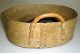 Puuta. Laidat ommeltu puunjuurella kiinni. Soikean muotoiseen puupohjaan on laidat kiinnitetty puunauloin. Vakassa on toisella sivulla (ompeleen puolella) puusta taivutettu kädensija, joka on ommeltu juurella laitaan kiinni. Kädensija on hyvin matala, ulkonee laidasta n.4 cm. Koristelu: Laidalle piirretty ja väritetty piirileikkiä tanssivia mies-ja naishahmoja. Kasvinlehtiä. Värit punainen ja vihreä. Kädensijan vieressä vuosiluku 1917, mustalla piirretty.