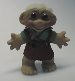 Peikko seisoo kädet levällään ja sillä on ruskeat silmät. Yllään huopakankaasta valmistettu punaiset housut ja vihreä paita. Hiukset valkoiset, tekokuitua. Niskassa lukee: U.S.A FOREIGN PATS PENDING MADE IN DENMARK. Peikon pään saa kääntymään.