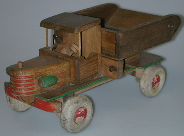 kuorma-auto lakattua ja punaisella ja vihreällä maalattua puuta. Pyöreälinjaisessa kuorma-autossa akseliin kiinnitetyt paksut pyörät. Konepeitto kaareva, kapeneva. Kuljettajan hytti nelikulmainen. Takaosassa leveä kippauslava, joka lukittavissa hakasella.