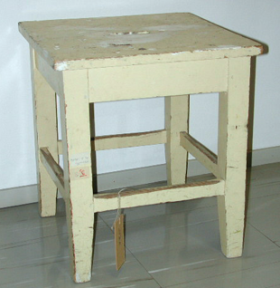 Neliskulmaisten jalkojen alaosat on viistetty hieman viistoksi. Sarjoihin on kiinnitetty neljällä ruuvilla istuinlevy, jonka keskellä on kädelle aukko. Alhaalla on lisäksi alasarjat. Puuta peittää vaaleankeltainen maali.